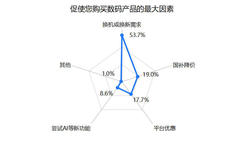 从调查结果来看,促使消费者购买3C数码产品的最大因素仍是换机或换新需求,占比为53.7%。也就是说,过半数的受访者倾向于在有明确更换需求时,才会做出购买行为。不过值得注意的是,其他外部因素对消费者行为的影响也占到相当比重,比如因“国补降价”和“平台优惠”而选择购买的占比均超过15%,“尝试AI新功能”的占比也达到8%。