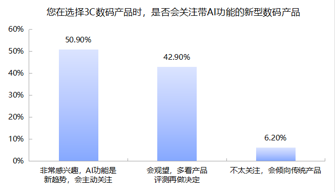 调查结果显示,在选择3C数码产品时,除了会主动关注AI数码产品的半数消费者,还有高达42.9%的消费者持观望态度,“多看产品评测再做决定”。而不太关注AI功能,倾向传统产品的消费者占比仅为6%。
