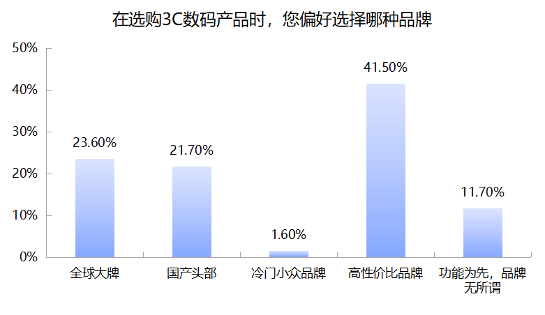 而在选购3C数码产品时,相比以往品牌因素占比较高,本次调查看到的明显变化是——更多消费者开始优先考虑高性价比品牌,占比达到41.5%。其次才是考虑全球大牌和国产头部品牌。