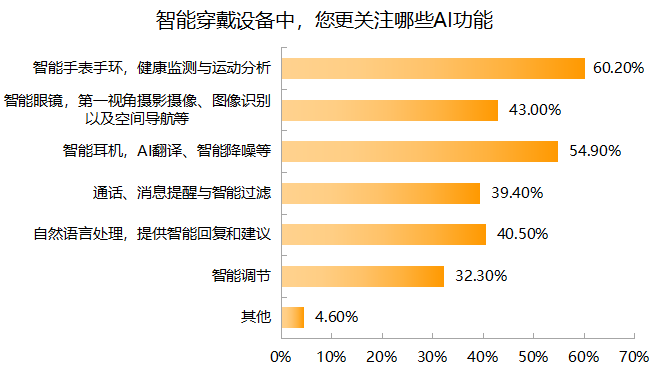 而在智能穿戴产品的细分中,智能手表的健康监测和运动分析成为关注程度最高的AI功能;其次是智能耳机和智能眼镜的相关功能,比如智能降噪、第一视角摄影摄像以及图像识别等。