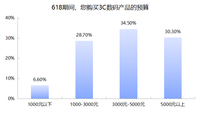 具体到今年618,智能手机、智能穿戴装备和无线耳机,在受访者已经或计划购买的数码产品中排名靠前。预算方面,34%的消费者预算在3000元-5000元,占比最高;预算在5000元以上的占比也达到30%。